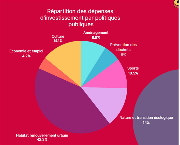 Les dépenses sont particulièrement orientées vers de grands projets liés au renouvellement urbain et à l’habitat, la transition écologique, la culture et les sports, l’aménagement.