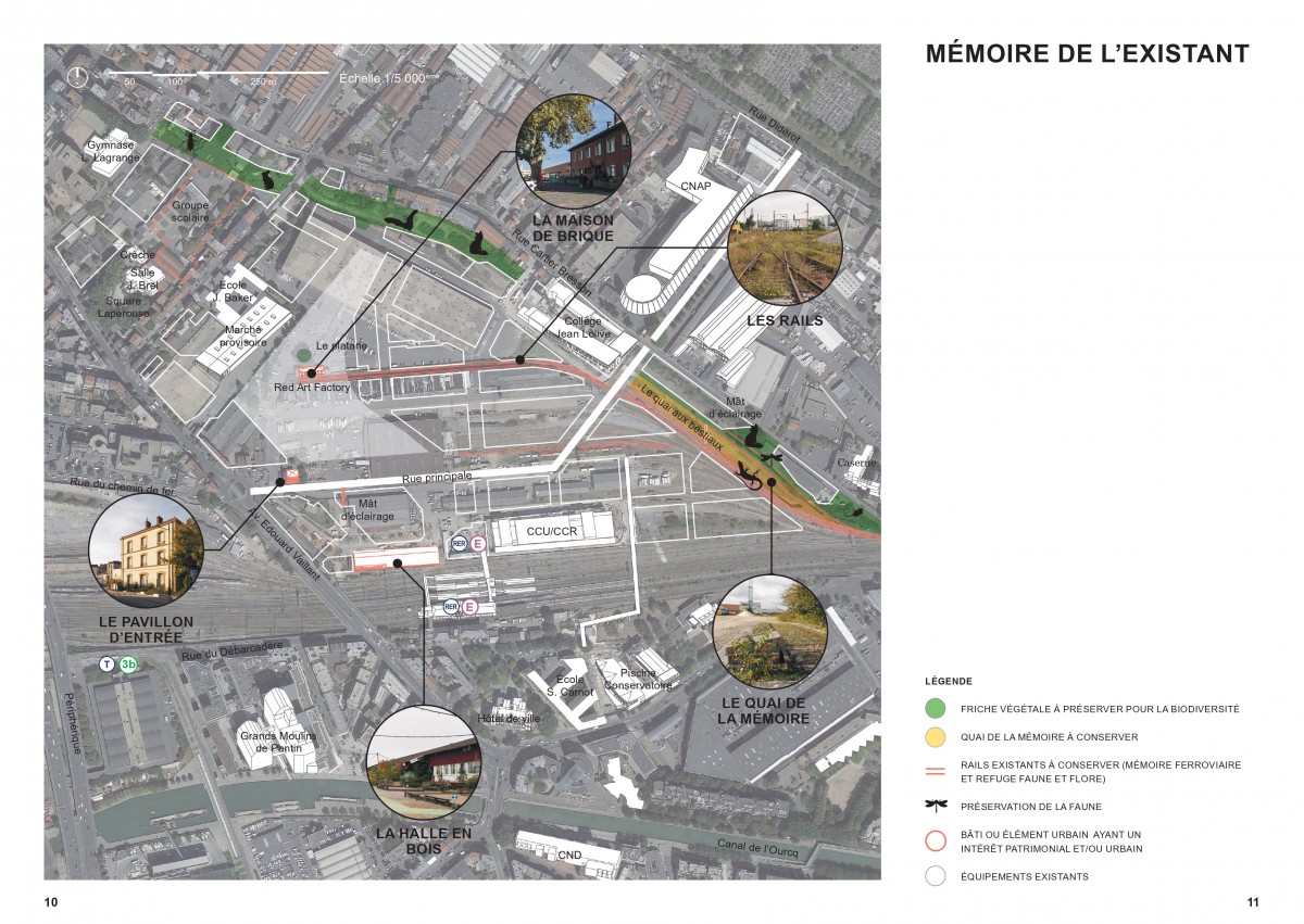 Ainsi, les matériaux issus de la déconstruction seront réemployés, tant sur les bâtiments que sur les sols. La renaturation de l’ancienne plateforme ferroviaire permettra d’apporter fraicheur et biodiversité au futur quartier, sans omettre de ménager ponctuellement des traces d’existants maintenus. La halle en bois, l’ancien quai aux bestiaux, le platane, s’inscriront comme repères dans le futur quartier, témoins de l’histoire du site.