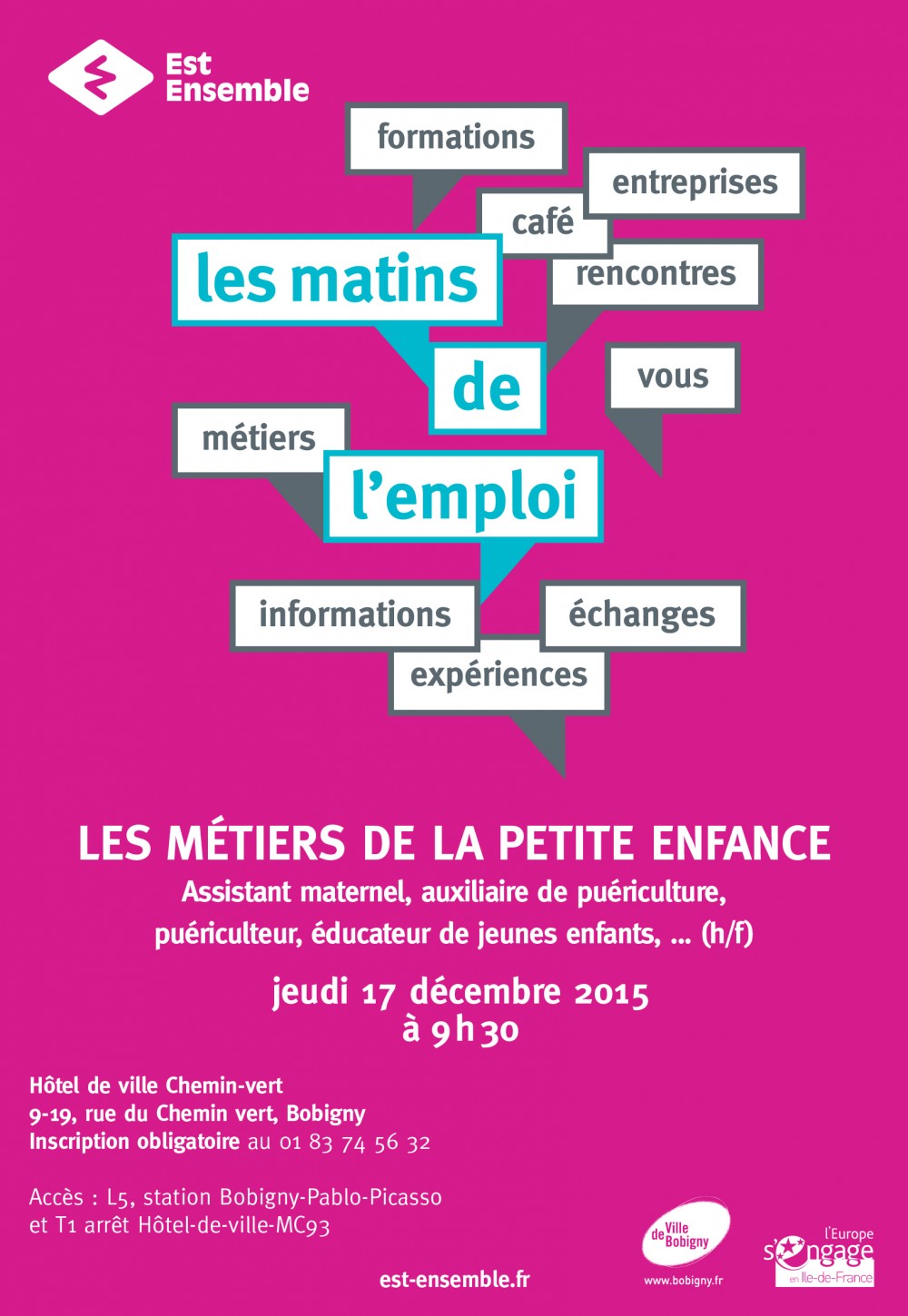 Jeudi 17 décembre 2015 à 9h30 à Bobigny, venez découvrir les métiers de la petite enfance (h-f) : assistant maternel, auxiliaire de puériculture, puériculteur, éducateur de jeunes enfants... en échangeant avec des entreprises du territoire et des organismes de formation. Inscription obligatoire.