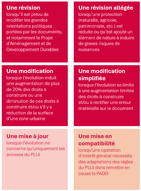 Selon l’importance des changements à apporter au PLUi, différentes procédures peuvent être mises en place. Ces procédures sont encadrées par le Code de l’urbanisme.