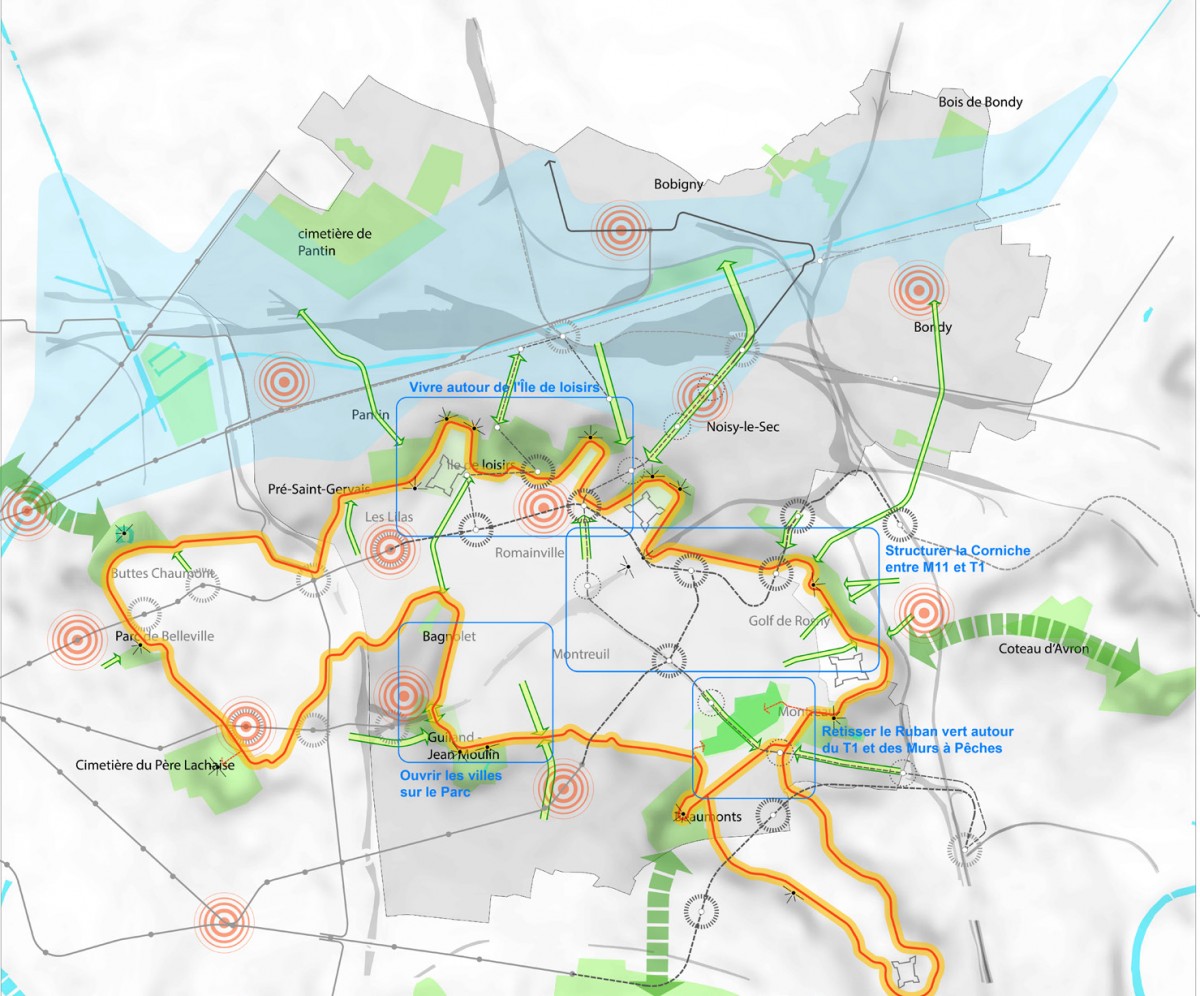 L’ensemble des Portes du Grand Paris sont des sites stratégiques au croisement des dynamiques métropolitaines et locales. Elles doivent devenir de véritables places, composées autour d’espaces publics fédérateurs et des projets communs. Chacun de ces sites est singulier mais a en commun un rapport à composer, renouveler, enrichir avec le territoire d’Est Ensemble et la métropole. L'enjeu principal de ce secteur est de reconnecter les territoires d'Est Ensemble entre eux et avec la métropole et d'intégrer les grandes infrastructures dans le tissu local. Il s'agira également de conforter le réseau d’espaces publics structurants pour les usages quotidiens.